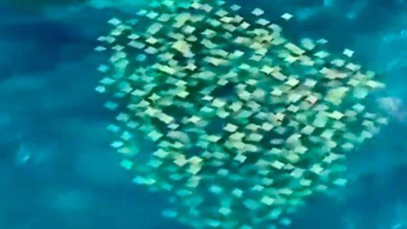 Пользователей соцсети удивило количество животных, оказавшихся вместе одновременно. Как выяснилось, это восточно-американские бычерылы, которые относятся к семейству орляковых скатов. Именно этот вид скатов встречается в природе в виде больших стай.