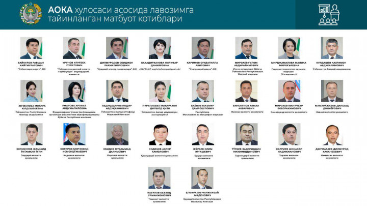 Заместитель главы Агентства информации и массовых коммуникаций Узбекистана Саида Мирзиёева представила общественности список пресс-секретарей в министерствах, ведомствах, акционерных обществах и хокимиятах.