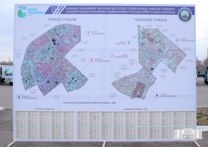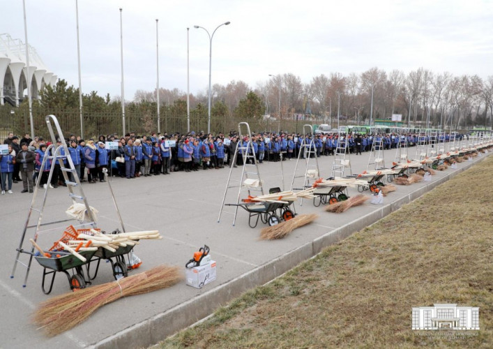 На автостоянке рядом со стадионом «Миллий» собрались лица, ответственные за проведение акции «Благодатный Ташкент» во главе с хокимом города, а также 1000 сотрудников, разделенные на 30 групп. Оплачивать труд поденным рабочим будут по 80 тысяч в день. Они также будут обеспечены 2-разовым питанием.