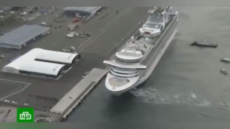 Круизный лайнер Diamond Princess, на борту которого были обнаружены зараженные коронавирусом пассажиры, уже несколько дней стоит на приколе у города Йокогама.