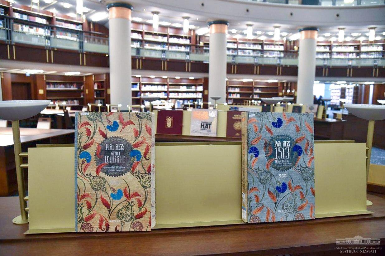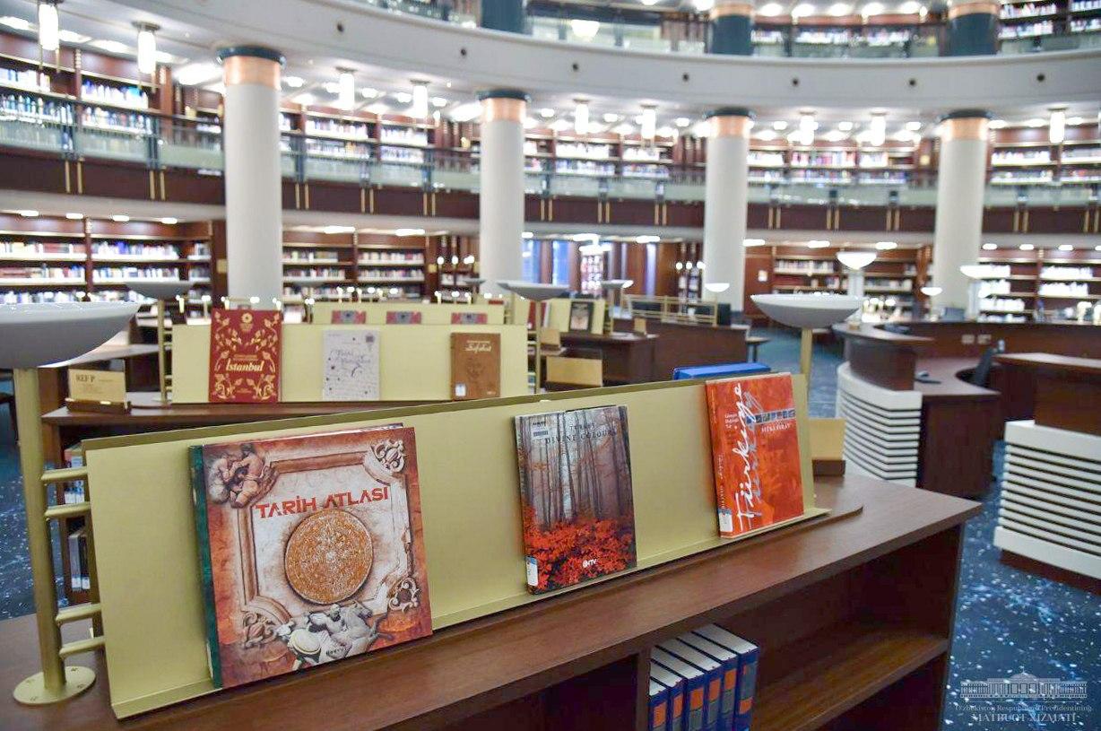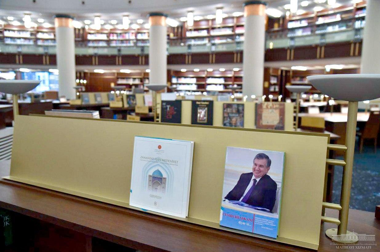 Шавкат Мирзиёев подарил библиотеке переписанную узбекскими каллиграфами копию редчайшего в мире Корана Усмана, факсимильные копии произведений «Маснави» Джалолиддина Руми и «История болезней» Абу Бакра ар-Рози, книгу-альбом “Факсимиле произведений Алишера Навои из библиотек Стамбула», а также книгу «Улмас кунгул» – сборник переведенных на узбекский язык стихов Юнуса Эмро.