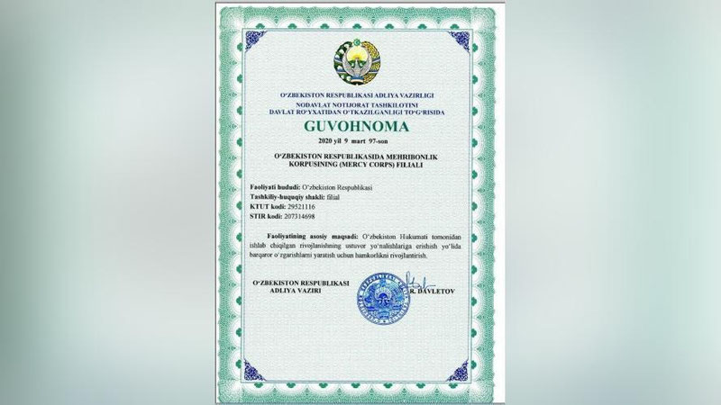 9 марта Министерством юстиции Республики Узбекистан зарегистрирован филиал международной некоммерческой организации «Корпуса Милосердия» (Mercy Corps) (США) в Узбекистане.