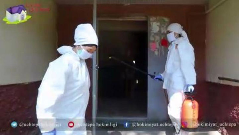 Хокимият Учтепинского района проводит дезинфекцию всех предприятий и организаций, подъездов многоэтажных домов, площадок и внутренних улиц махаллей.