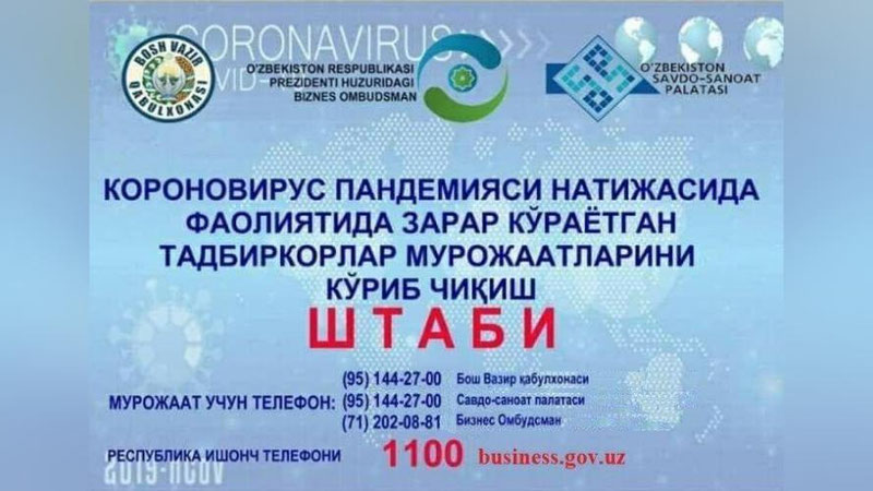 - Колл-центр Штаба, организованного в здании Ташкентского регионального отделения Торгово-промышленной палаты (95)144-27-00.
