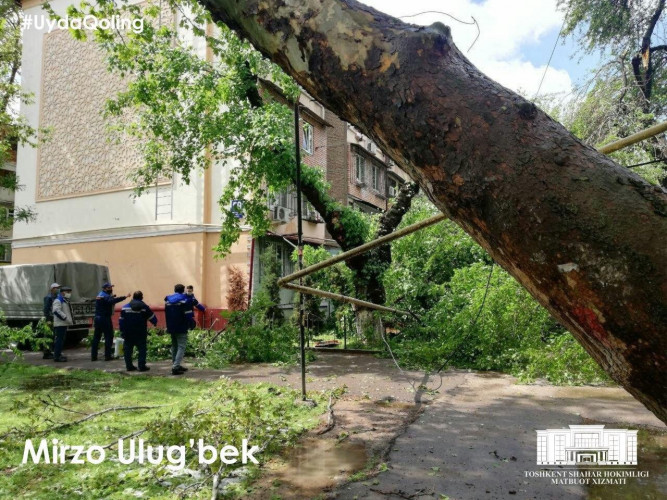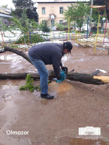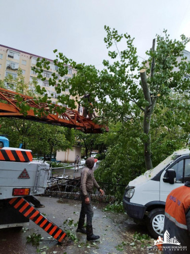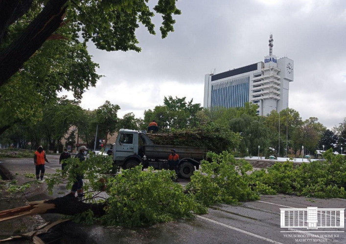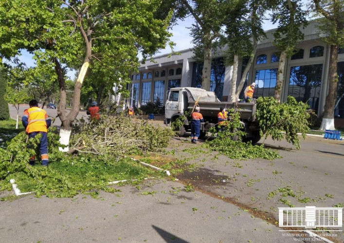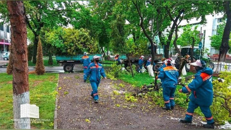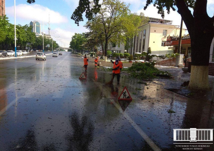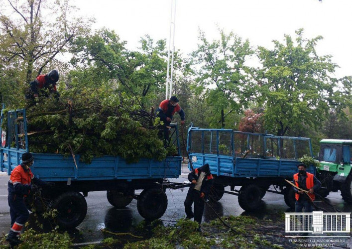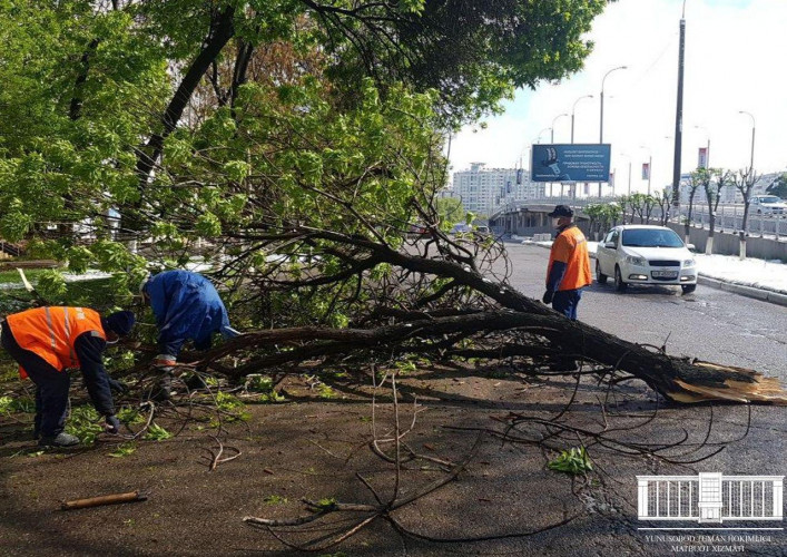 Сломанные ветки в Юнусабадском районе были распилены и выброшены. Территория была очищена от мусора и приведена в порядок. В некоторых кварталах произошли временные перебои в подаче электроэнергии из-за повреждения линий электропередачи, и районная компания по электроснабжению приняла неотложные меры для устранения проблем.