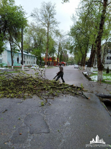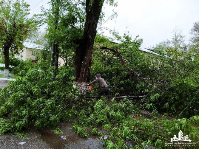 Хокимият Чиланзарского района проводит работы с привлечением всех сил и оборудования в районе для уборки сломанных деревьев и веток, ремонта поврежденных линий электропередач и поврежденных газопроводов.