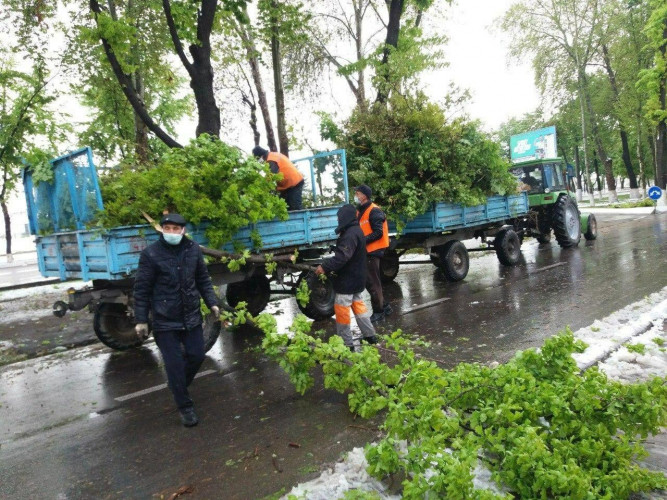 Управление по благоустройству города Ташкента и районов направили рабочую силу и технику на очистку территорий от сломанных веток и деревьев.