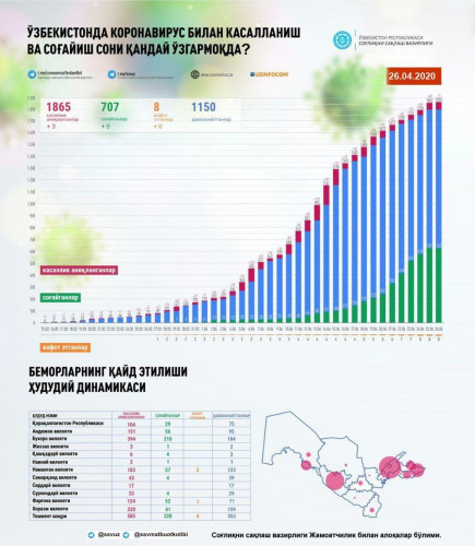 По количеству выздоровевших лидируют Ташкент (228), Бухара (210) и Хорезм (61).