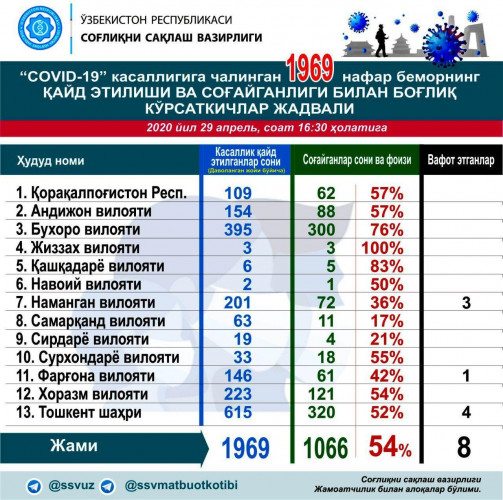 В Узбекистане всего вылечено 1066 больных, то есть 54% от зараженных. В Джизакской области выписаны все трое заразившихся, в Навои и Кашкадарье осталось по 1 пациенту в COVID-19.