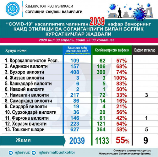 По состоянию на 23:00 30 апреля в Узбекистане число случаев заражения коронавирусной инфекцией составляет 2039 (+70 с 16:30 29 апреля).