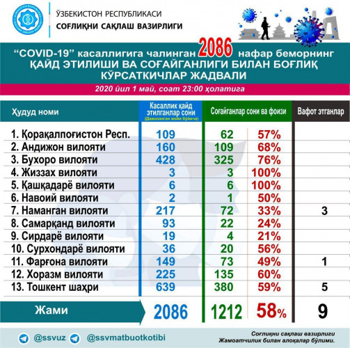 В Узбекистане всего вылечено 1212 больных (+79), то есть 58% от зараженных. В Джизакской и Кашкадарьинской областях выписаны все заразившиеся, в Навои остался 1 пациент с COVID-19. В Узбекистане зафиксировано 9 летальных исходов в статистике распространения пандемии.