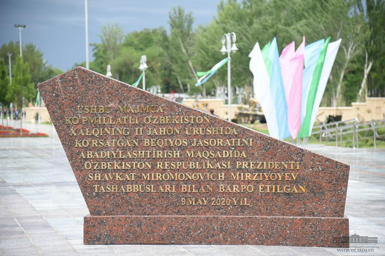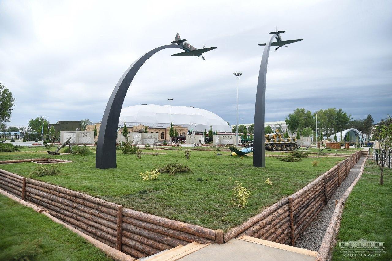 На территории парка установлена композиция, состоящая из мраморных панно. На них изображены эпизоды из истории наших предков-полководцев, важнейшие сведения о Второй мировой войне, а также боеспособность национальной армии современного Узбекистана. Звучат песни и сообщения военных лет, создавая историческую атмосферу того периода.