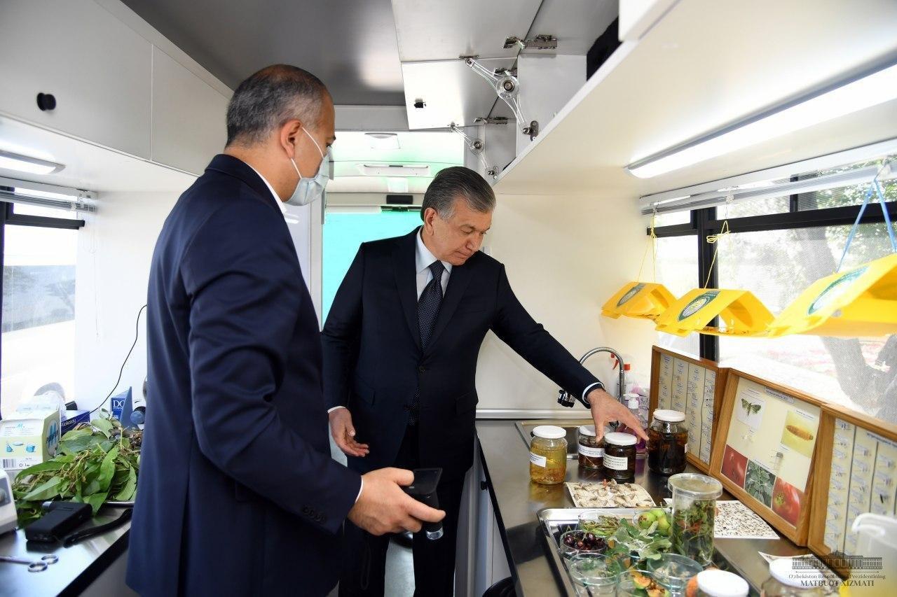 Глава государства ознакомился также с передвижной агрохимической лабораторией на базе переоборудованного автобуса.
