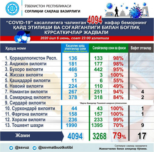 В Узбекистане зафиксировано 17 летальных исходов в статистике распространения пандемии (+1 смерть 70-летнего пациента в Ташкенте 6 июня).