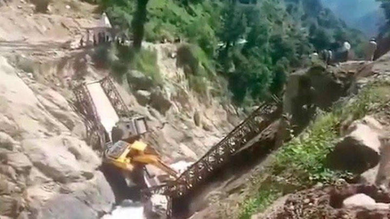 В Индии под весом грузовика обрушился мост через горную реку. Машина с экскаватором рухнула с высоты многоэтажки. Видео происшествия попало в Сеть.