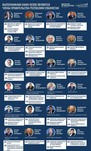 Общенациональное движение "Юксалиш" поделилось информацией о том, выпускниками каких вузов являются члены правительства Узбекистана.