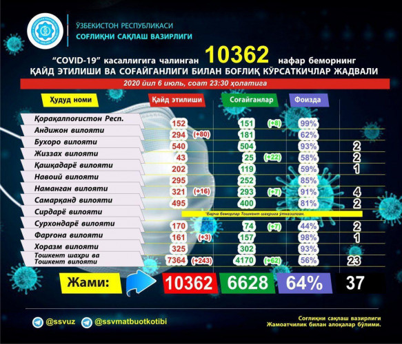 В Узбекистане зафиксировано 37 летальных исхода в статистике распространения пандемии, причем за один день 6 июля было сообщено о трех смертях пациентов - все жители Ташкента: 43-летний житель Учтепинского района, 67-летний житель Алмазарского района, и 86-летняя жительница Чиланзарского района.