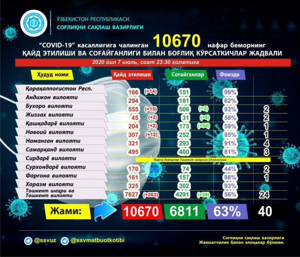 По состоянию на 23:30 7 июля число случаев заражения коронавирусной инфекцией составляет 10 670 (+308 за минувший день, сутками ранее рекордные +342).