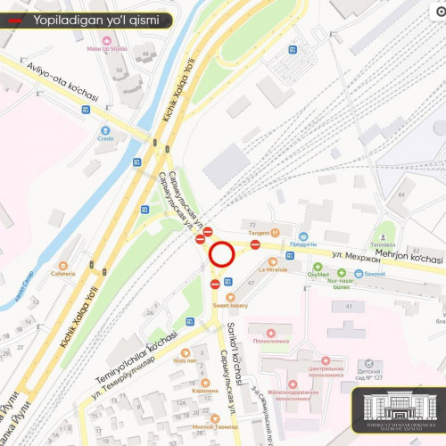 Кроме того, до 10:00 13 июля участок дороги с круговым движением на пересечении улиц Мехржон и Сарыкульской из-за проведения дорожных работ будет закрыт для движения.