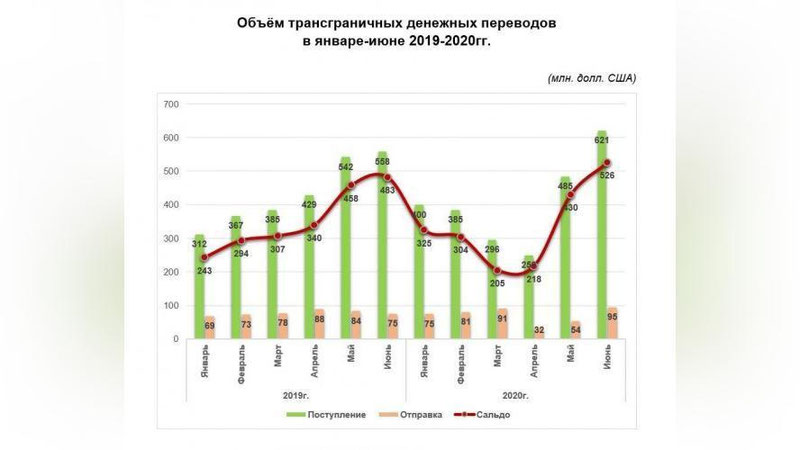 Объём поступивших в республику трансграничных переводов составил 2,4 млрд. долл. США, снизившись по сравнению с аналогичным периодом предыдущего года на 156 млн. долл. или 6%.