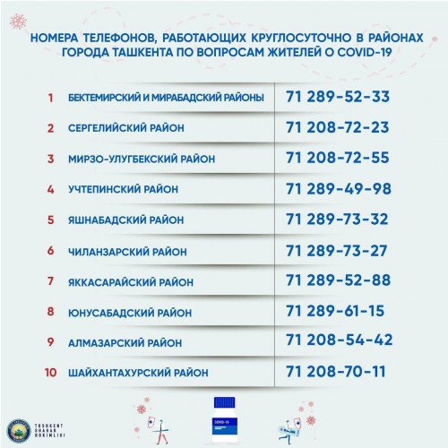 Минздрав опубликовал телефоны по районам Ташкента, куда можно обратиться по вопросам COVID-19.
