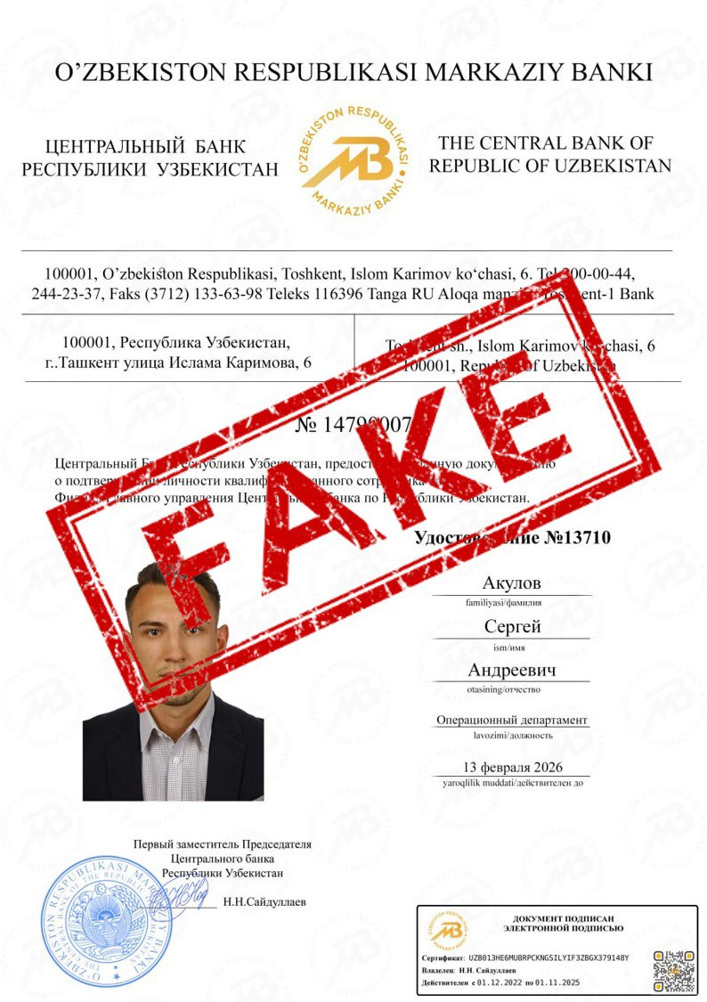 "Марказий банк бу каби хабарлар ва аккаунтларга Ўзбекистон Республикаси Марказий банкининг ҳеч қандай алоқаси йўқлигини маълум қилади.