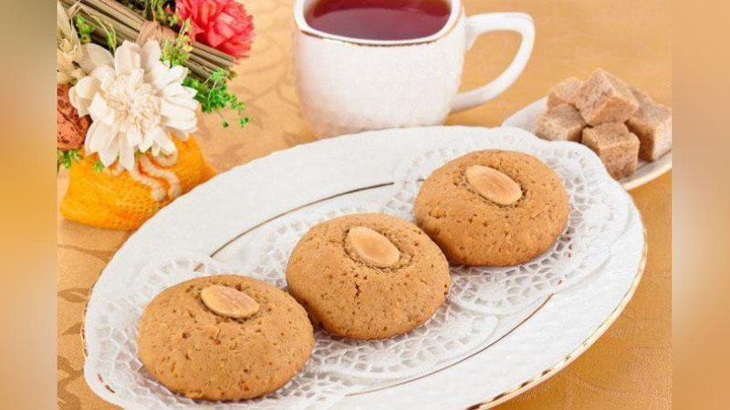 4. Навбат ун ва хамирюмшатгичга келди. Уларни ҳам солиб, хамир тайёрланг. Хамирдан кичик зувалачалар ясаб, пишириқ қоғози солинган газ патнисига териб чиқинг. Устидан қўлингиз билан босиб, бодом мағзидан бир донадан қўйинг. Ширинлигимиз 180 даражада қиздирилган газ печида 20-25 дақиқада пишади.