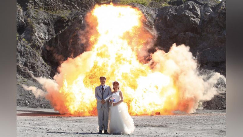 Япониялик келин-куёв ортларидаги портлаш жараёнида тўй фотосессиясини ўтказишди. Пиротехник воситалар портлаб, олов сачраганда ҳам келин-куёв қилт этмай, хотиржам равишда суратга тушишда давом этди.