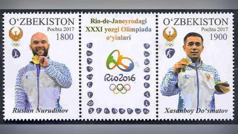 Почта маркаларида спортчилар: Руслан Нурудинов (штанга) ва Хасанбой Дўсматов (бокс) тасвирланган.