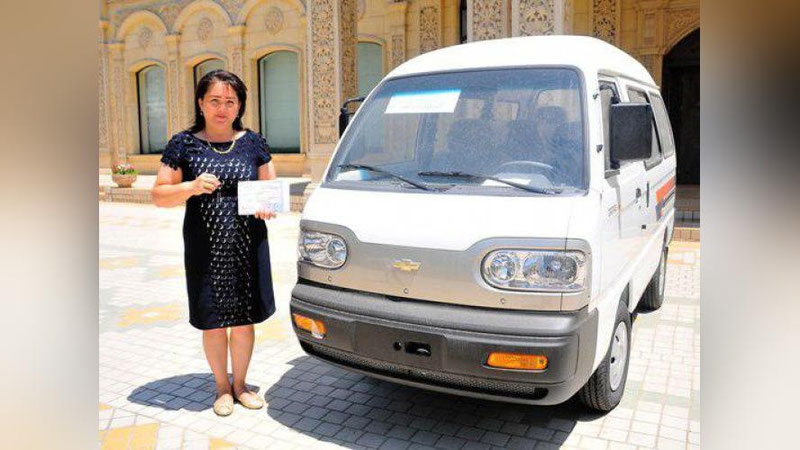 Олий Лига 14-туридан ўрин олган "Пахтакор" - "Насаф" (2:1) учрашувида "Дамас" автомобилига эга чиққан Зарифа Исмоилова совғасини қабул қилиб олди.