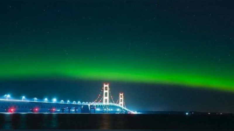 Макинак кўприги устида ноёб табиат ҳодисаси бўлган қутб ёғдуси акс этган видео АВС телеканалининг Twitter саҳифасига жойлаштирилди. Олимларнинг маълумот беришича, мазкур кенгликка хос бўлмаган қутб ёғдусининг пайдо бўлишига Қуёшдаги кучли магнит бўрони сабаб бўлган. Мазкур гўзалликдан нафақат Мичиган, балки Вашингтон, Висконсон, шу билан бирга Нью-Йорк аҳолиси ҳам баҳраманд бўлди.
