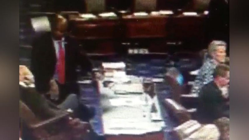 Мазкур ролик Twitter ижтимоий тармоғига жойлаштирилди. Видеороликда Obamacare ислоҳотини бекор қилиш масаласига бағишлаб ўтказилаётган йиғилишда дунё бехабар ўтирган сенаторнинг бошига балкондан ноутбук тушиб кетгани акс этган. Бундан сенатор қаттиқ қўрққанига қарамай, тан жароҳати олмади.