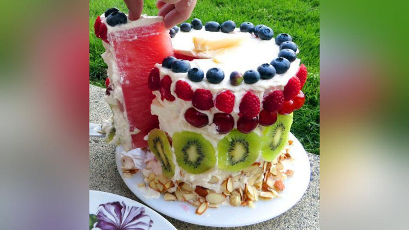 Тайёрланиши: 1) Тарвузнинг икки тарафидан қалпоқ кўринишида кесинг. Сўнг суратда кўрсатилганидек ичини ажрати нг. 2) Қаймоққа шакарни аралаштириб, миксер ёрдамида кўпиртиринг. Тарвуз бўлагига қаймоқни суртиб, атрофини бодом мағзи, устини мевалар билан безатинг.