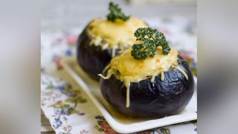 Зарур масаллиқлар: 2 дона думалоқ бақлажон, 300 гр. мол гўшти қиймаси, 100 гр. пишлоқ, 1 бош пиёз, ярим боғ петрушка, туз.